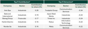 *The monthly contributors and detractors as disclosed above are for illustrative purposes only and do not represent all the securities purchased or sold. The total sum of securities held within the portfolio drive overall portfolio performance. To request the full securities list including individual security returns and contribution to portfolio performance, please email invest@associateglobal.com.