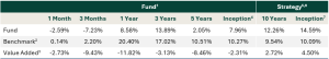 The Fund delivered a return of -2.59% during the month, compared with the Benchmark2 return of 0.14%.