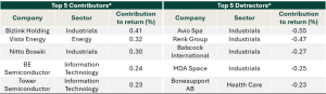 *The monthly contributors and detractors as disclosed above are for illustrative purposes only and do not represent all the securities purchased or sold. The total sum of securities held within the portfolio drive overall portfolio performance. To request the full securities list including individual security returns and contribution to portfolio performance, please email invest@associateglobal.com.